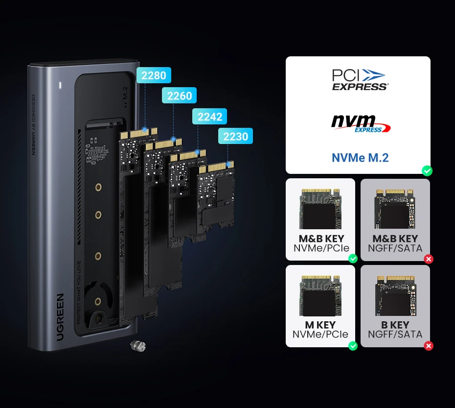 Compatible with 4 specifications of SSD including 2280, 2260, 2242, 2230